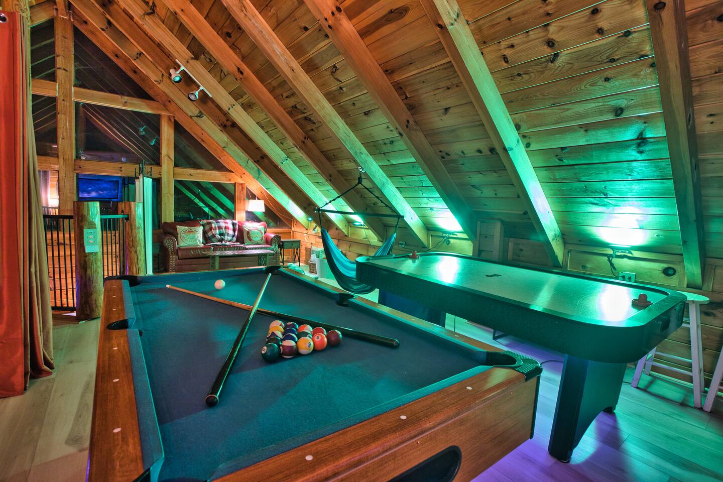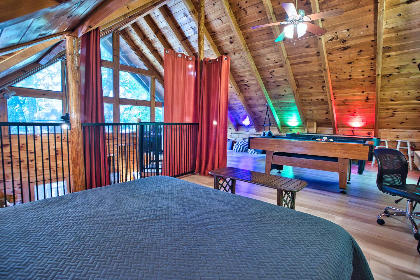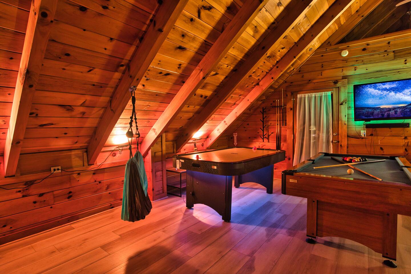 Wake up to the sounds of the forest, sip coffee on the deck, and end the day with a soak in your private hot tub or updated luxury soaking bathtub. The Colibri offers the perfect blend of cabin charm, modern comfort, and fun for every guest—whether you’re here for a romantic getaway, family adventure, or friends’ retreat. Cozy & Comfortable Sleeping Spaces: -Master suite with queen log bed, soaking tub, smart TV, and warm, rustic décor -Loft-level king bed with privacy curtain, workspace, and pull-out queen sofa for extra sleeping space, so everyone has room to relax Relax & Gather Together: -Living room with gas fireplace (Oct–Apr) and smart TV for movie nights -Well-equipped kitchen stocked with cookware, coffee makers, and essentials -Dining area perfect for shared meals and game nights Entertainment for All Ages: -Game room with LED air hockey, pool table, hammock chair, and board games -Juliet balcony and floor-to-ceiling windows for a bright, airy feel -Toys, pack-n-play, booster seat, and plastic dishware for families Outdoor Bliss: -Private hot tub with color-changing lights -Rocking chairs, hammock, and forest-view decks -Charcoal grill, folding chairs, and s’mores sticks for evenings by the fire The Perfect Location: -18 minutes to Pigeon Forge, Gatlinburg, and Great Smoky Mountains National Park -Close to Dollywood, The Island, scenic hikes, and waterfalls -Secluded enough to feel private, yet minutes from top attractions Book your Smoky Mountain getaway at The Colibri today—comfort, adventure, and lasting memories await.