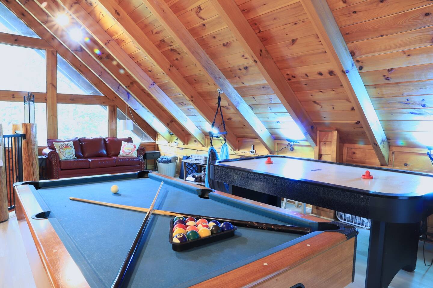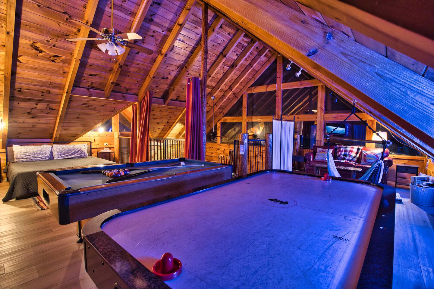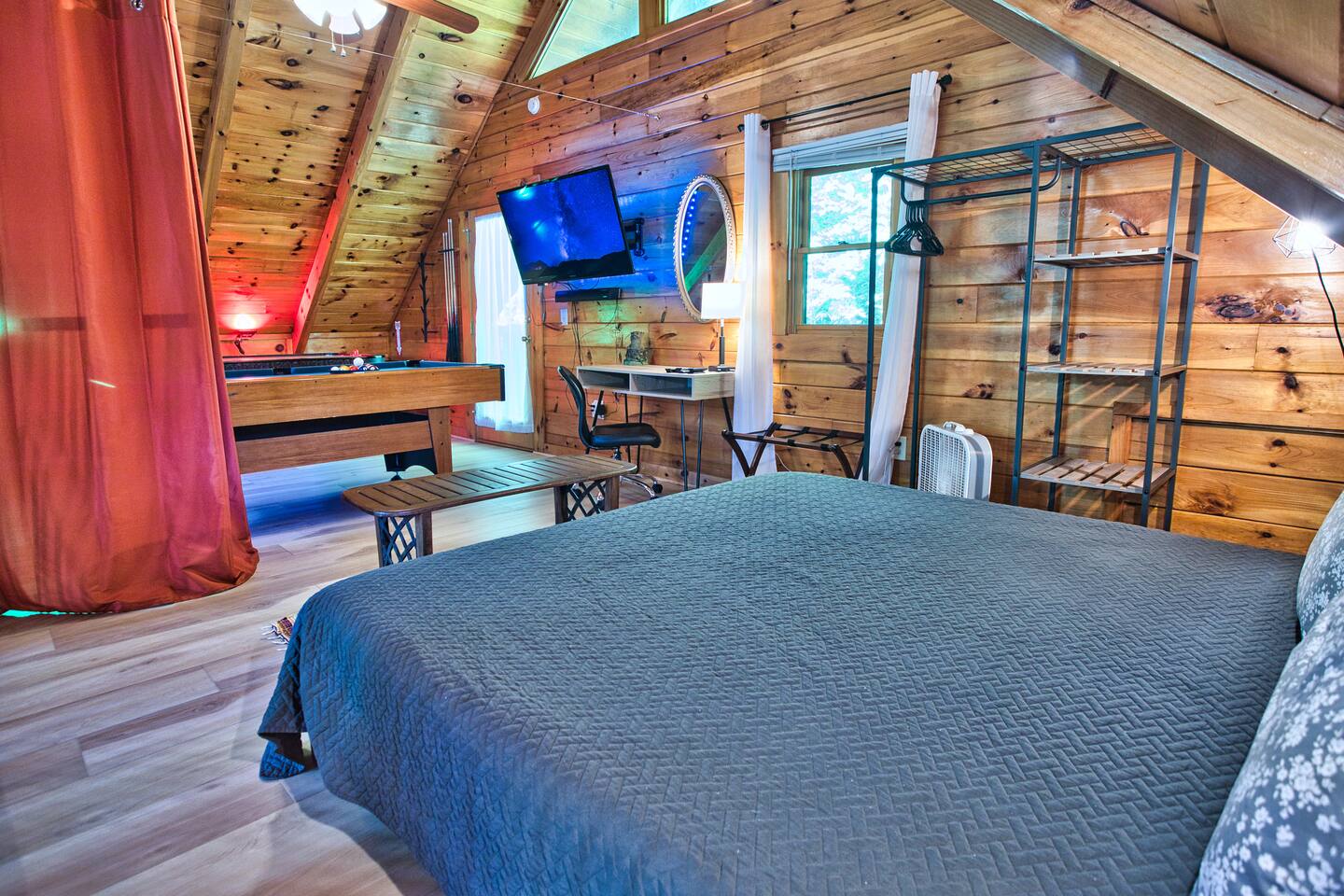 Wake up to the sounds of the forest, sip coffee on the deck, and end the day with a soak in your private hot tub or updated luxury soaking bathtub. The Colibri offers the perfect blend of cabin charm, modern comfort, and fun for every guest—whether you’re here for a romantic getaway, family adventure, or friends’ retreat. Cozy & Comfortable Sleeping Spaces: -Master suite with queen log bed, soaking tub, smart TV, and warm, rustic décor -Loft-level king bed with privacy curtain, workspace, and pull-out queen sofa for extra sleeping space, so everyone has room to relax Relax & Gather Together: -Living room with gas fireplace (Oct–Apr) and smart TV for movie nights -Well-equipped kitchen stocked with cookware, coffee makers, and essentials -Dining area perfect for shared meals and game nights Entertainment for All Ages: -Game room with LED air hockey, pool table, hammock chair, and board games -Juliet balcony and floor-to-ceiling windows for a bright, airy feel -Toys, pack-n-play, booster seat, and plastic dishware for families Outdoor Bliss: -Private hot tub with color-changing lights -Rocking chairs, hammock, and forest-view decks -Charcoal grill, folding chairs, and s’mores sticks for evenings by the fire The Perfect Location: -18 minutes to Pigeon Forge, Gatlinburg, and Great Smoky Mountains National Park -Close to Dollywood, The Island, scenic hikes, and waterfalls -Secluded enough to feel private, yet minutes from top attractions Book your Smoky Mountain getaway at The Colibri today—comfort, adventure, and lasting memories await.