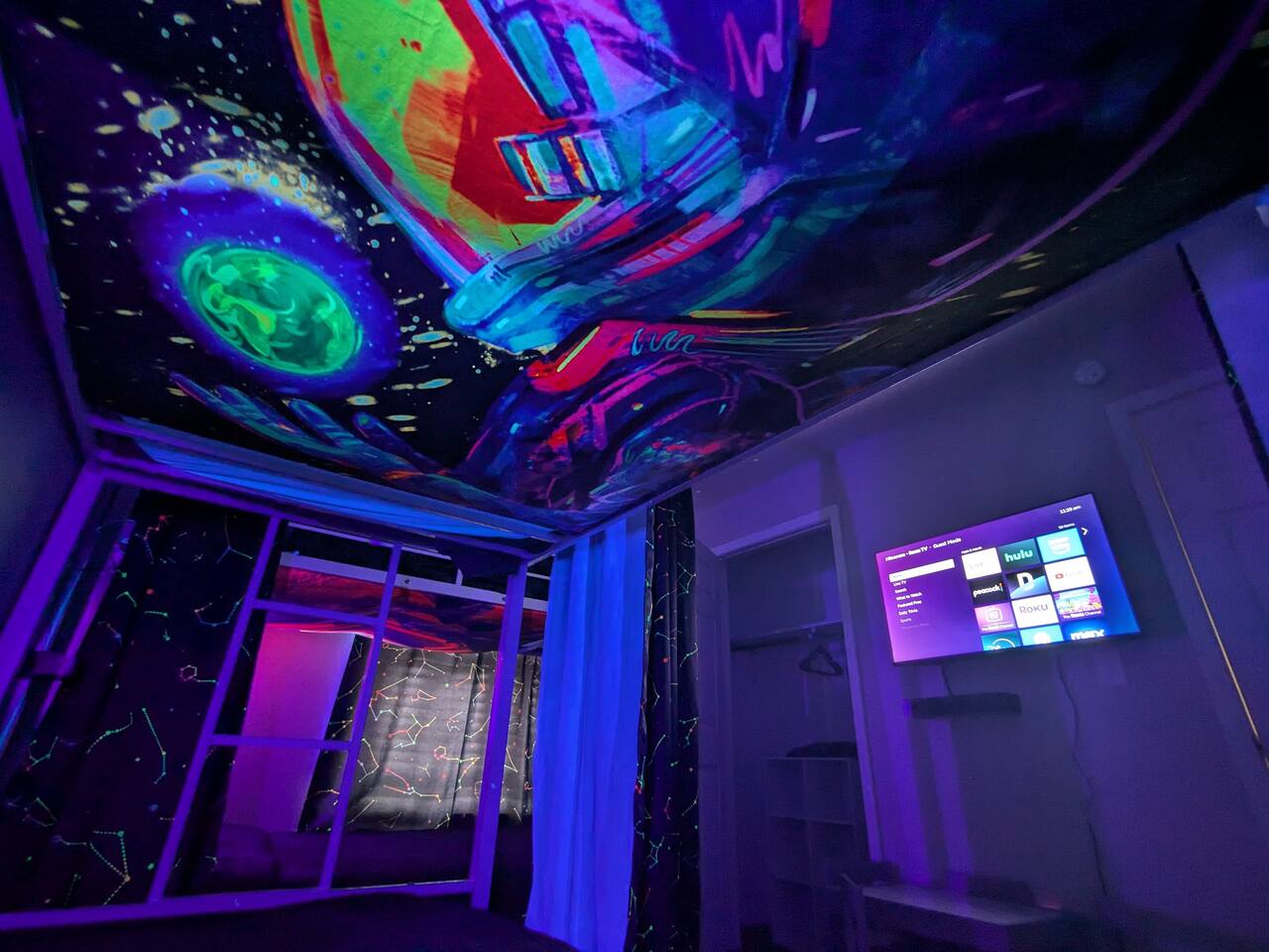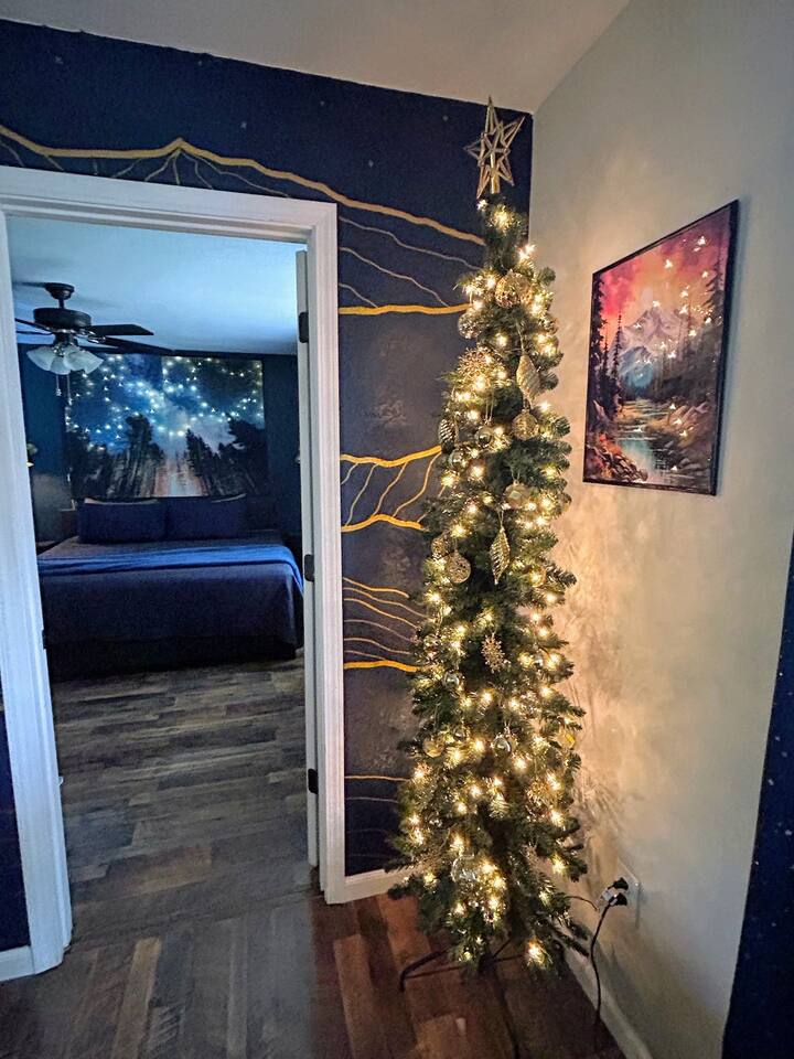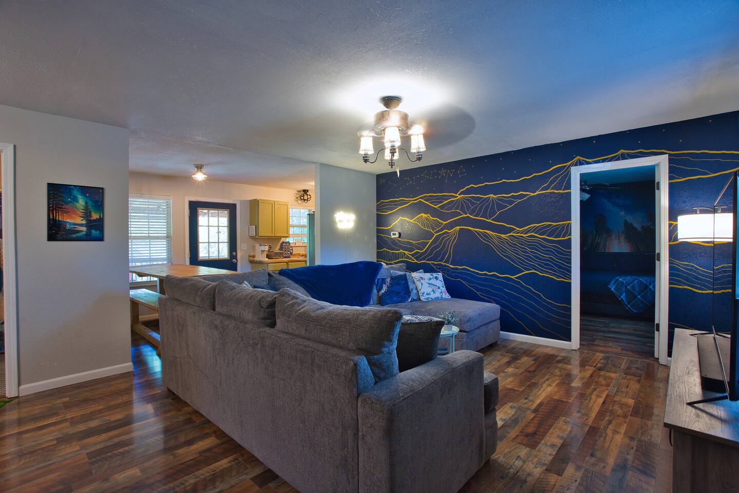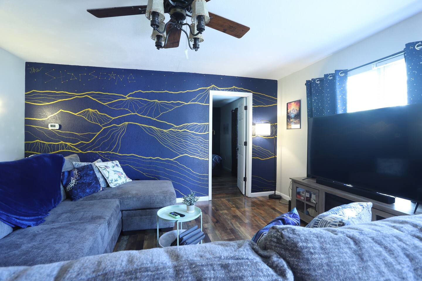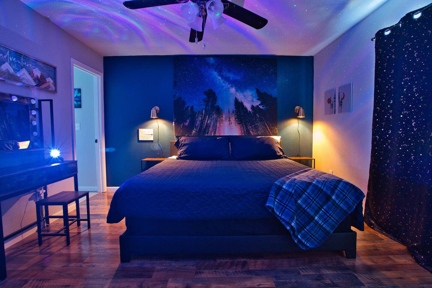 Tucked away in a quiet Sevierville valley, Starscape Cabin is a peaceful single-level 3-bedroom, 2-bath escape perfect for families, adventurers, and stargazers. With no city lights to dim the view, enjoy breathtaking night skies right from your deck or fire pit. Bedrooms: -King suite with starry-night theme, en-suite bath, makeup station, smart TV, and Aurora projector for a magical glow -Queen bedroom with nursery area (pack-n-play, sound machine, monitor, reading chair, astronaut lighting) -Bunk room with neon tapestries, black lights, smart TV, and Nintendo Switch dock -Living room pull-out couch for extra sleeping space Living & Dining: -Fully stocked kitchen with Keurig, drip coffee maker, kids’ dishware, and highchair -Dining table for family meals and game nights -Living room with cozy seating, electric fireplace, smart TV, surround sound, and immersive star projector Outdoor Space: -Covered back deck with grill, star lights, and seating for outdoor dining -Fenced yard with fire pit for s’mores and stargazing -Scenic valley views for a true “away from it all” feeling Nearby Adventures: Douglas Lake – 10 minutes Great Smoky Mountains (Cosby entrance) – 20 minutes Dollywood – 23 minutes Gatlinburg – 35 minutes Pet-Friendly -Bring your furry friends—fenced yard included (must be added to booking) Relax, recharge, and make unforgettable Smoky Mountain memories under the stars.