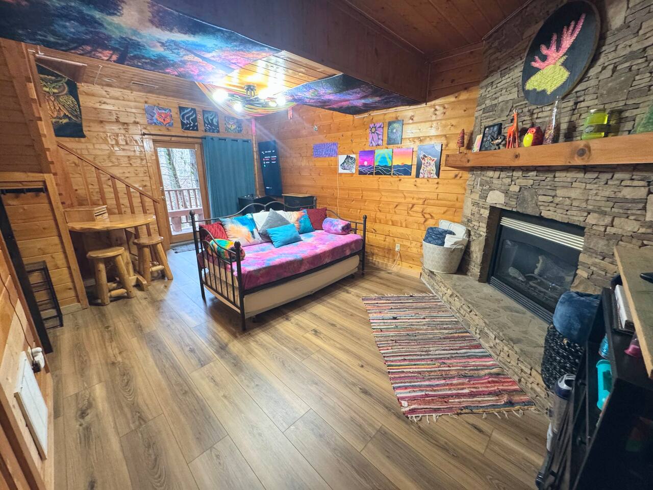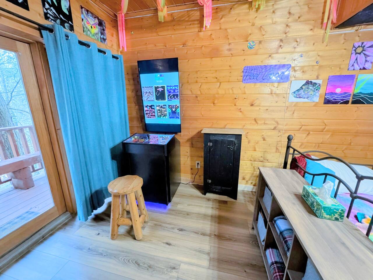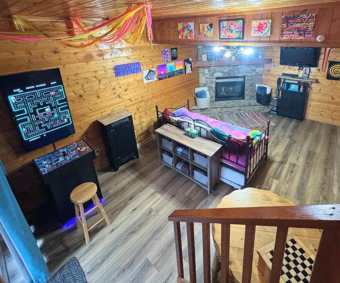 Why You’ll Love It: -Main-level king suite with soaking tub and peaceful forest views -Second king bed in a private curtained room downstairs -Neon-themed black light game room with darts, LED lights, Bluetooth speaker, games, and a twin trundle bed -Pull-out couch for extra sleeping space -Fully stocked kitchen and dining area for family meals -Cozy living room with gas fireplace (Oct–Apr) and smart TV -Two spacious decks—upper with dining and a swing, lower with a private hot tub -Charcoal grill and outdoor seating for BBQ nights -Newly paved driveway with parking for 2 or 3 cars -High-speed Wi-Fi, smart TVs, and a washer/dryer for longer stays Family-Friendly Touches Pack-n-play, booster seat, toys, and games provided to make traveling with kids easy. Prime Location: -12 min → Pigeon Forge & The Island -15 min → Dollywood -20 min → Gatlinburg -25 min → Great Smoky Mountains National Park Whether you’re soaking in the hot tub, playing in the game room, or sipping coffee on the deck surrounded by trees, The Calandria is your perfect Smoky Mountain getaway.